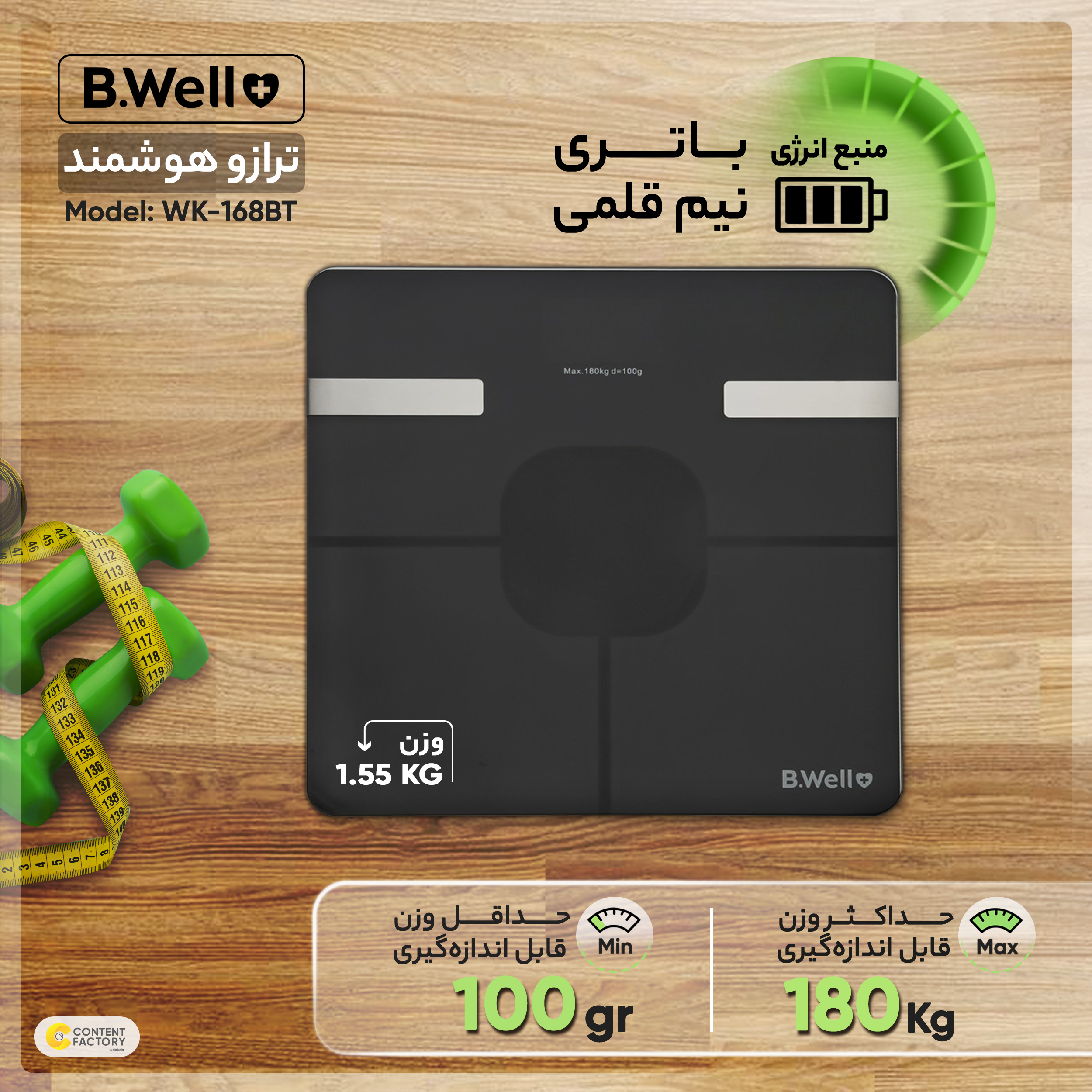 ترازو تشخیصی بی ول مدل WK-168 BTدارای قابلیت تشخیص BMI و انتقال نتایج به اپلیکشن موبایل سیستم اندروید برای بررسی و ذخیره کردن نتایج میباشد. ترازو 168BT با اندازه حداکثری وزن تا 180 کیلوگرم مناسب برای استفاده برای منزل و باشگاه های ورزشی میباشد. این محصول دارای صفحه نمایشگر LCD به رنگ قرمز برای خوانش بهتر نتیجه وزن کشی میباشد که خواندن نتیجه را برای کاربر بسیار آسان میکند. ترازوی تشخیصی بی ول علاوه بر تشخیص BMI قابلیت محاسبه چربی، میزان آب بدن، درصد عضله، توده استخوانی، تجزیه و تحلیل کالری و شاخص توده بدنی میباشد، و دارای 3 واحد اندازه گیری به کیلوگرم، پوند و استون ( معادل 112 پوند انگلیس ) میباشد که دارای 4 سنسور هر چهار طرف ترازو برای سنجش دقیق تر وزن میباشد.